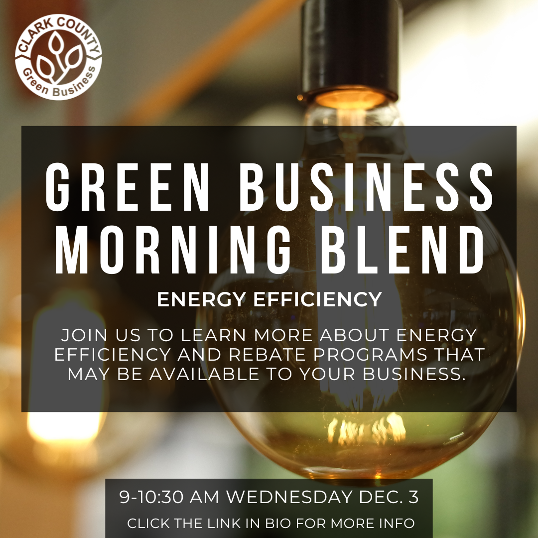 Join us as we hear from our speakers from Energy Trust of Oregon and Clark Public Utilities. This is an opportunity for you to learn more about energy efficiency and incentives and rebates that may be available to your business. Enjoy some fresh coffee and pastries while you network with other sustainability-minded businesses.